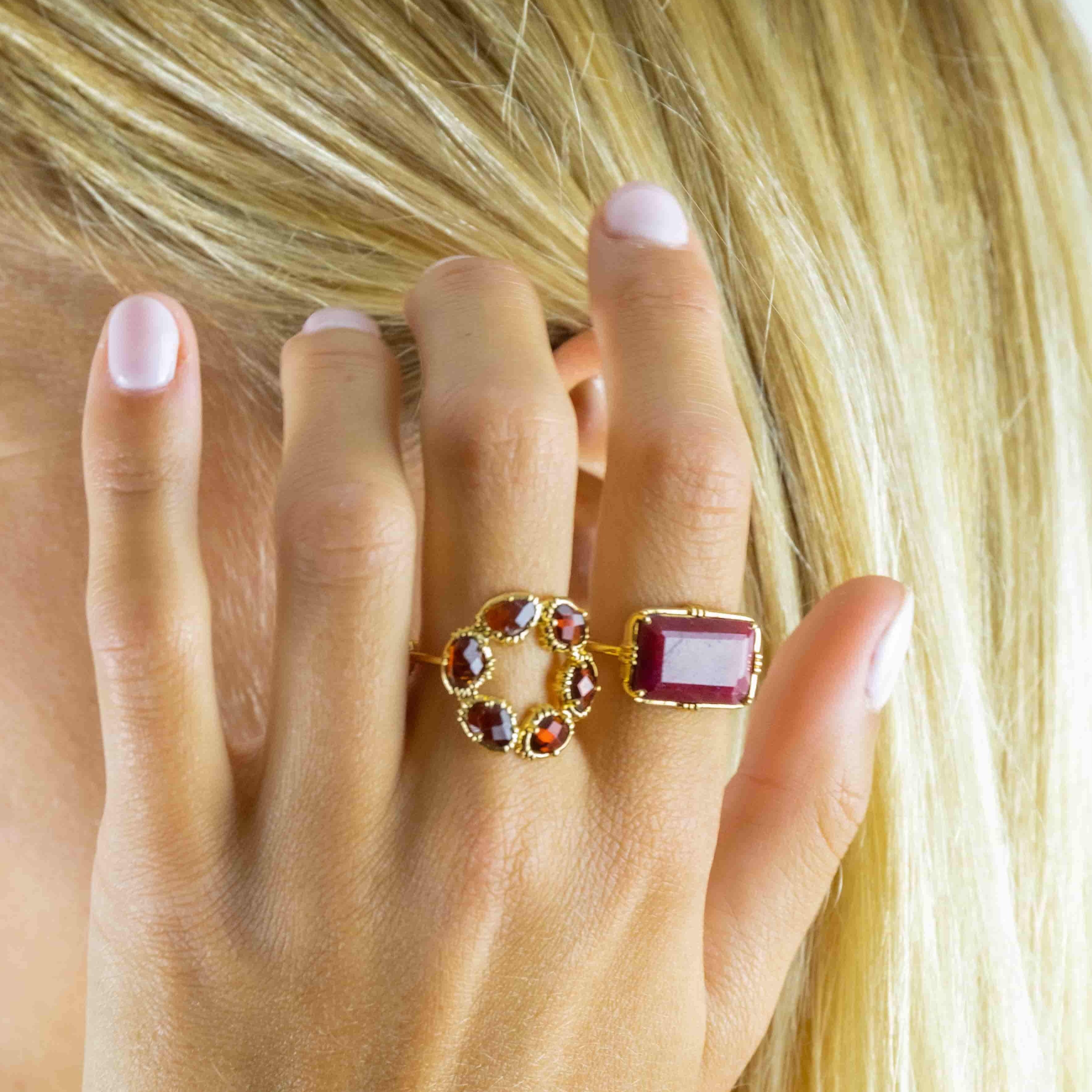 Bague ronde avec pierres semi-précieuse en grenat, et plaquée or 18 carats.