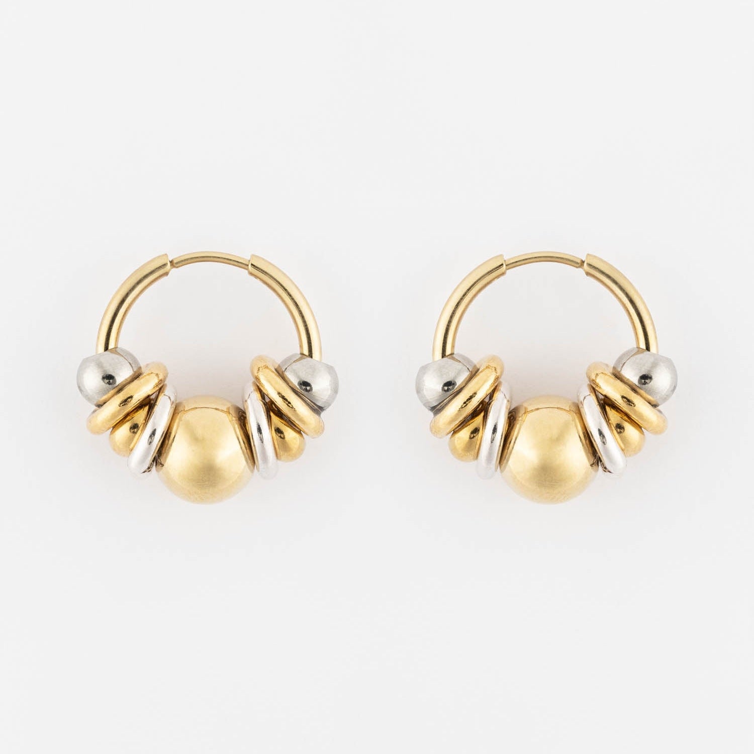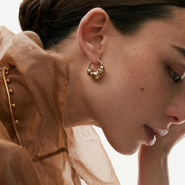 Les boucles d'oreilles Bubble Uni ornées d'une grande perle dorée, sont à la fois structurées et modernes. Un design puissant pour affirmer un style unique.