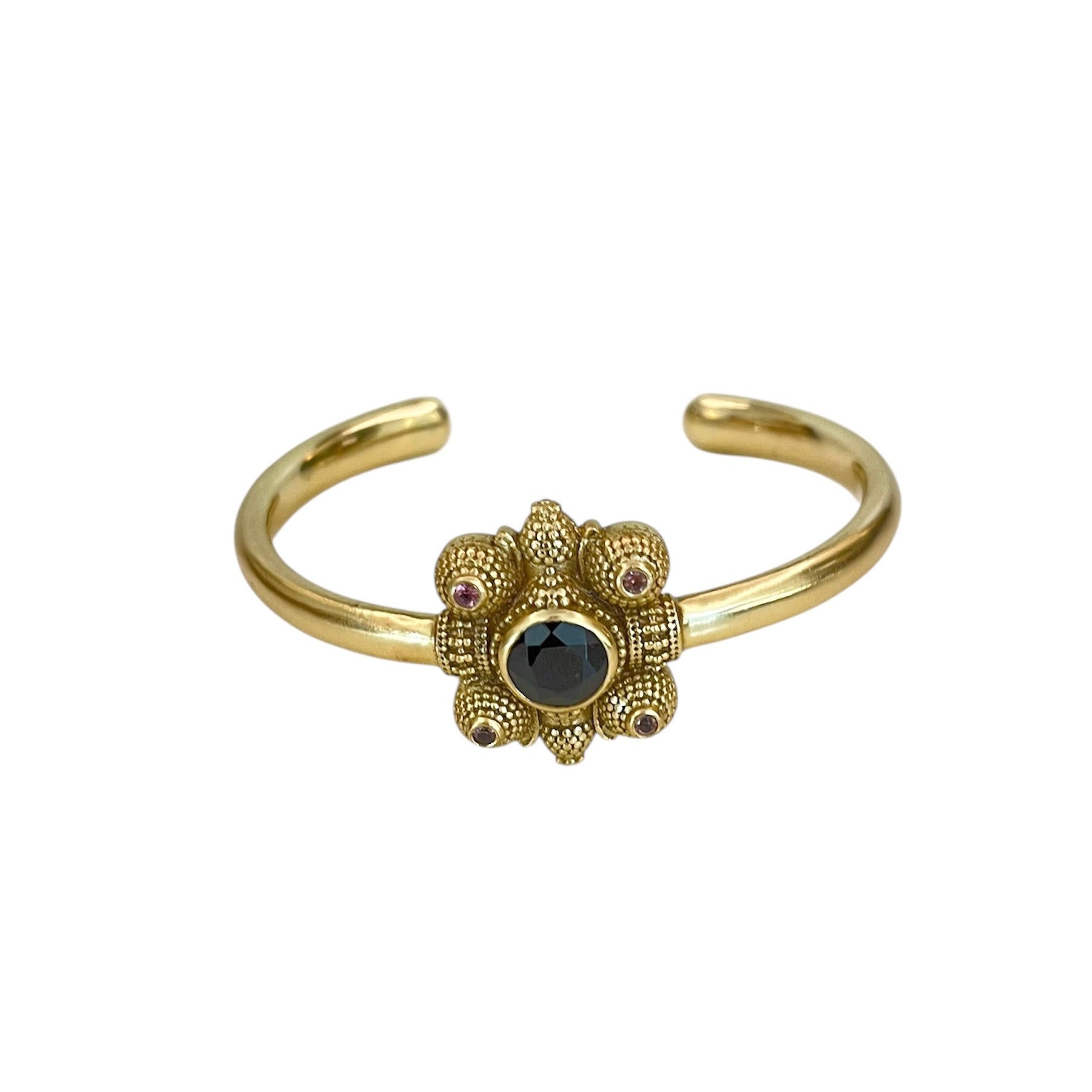 Au centre, un grenat profond foncé , entouré de quatre tourmalines, confère à la pièce une force symbolique et une présence singulière. Chaque détail a été pensé avec soin : un bijou qui raconte une histoire, à la fois précieux, enraciné et chargé de sens.