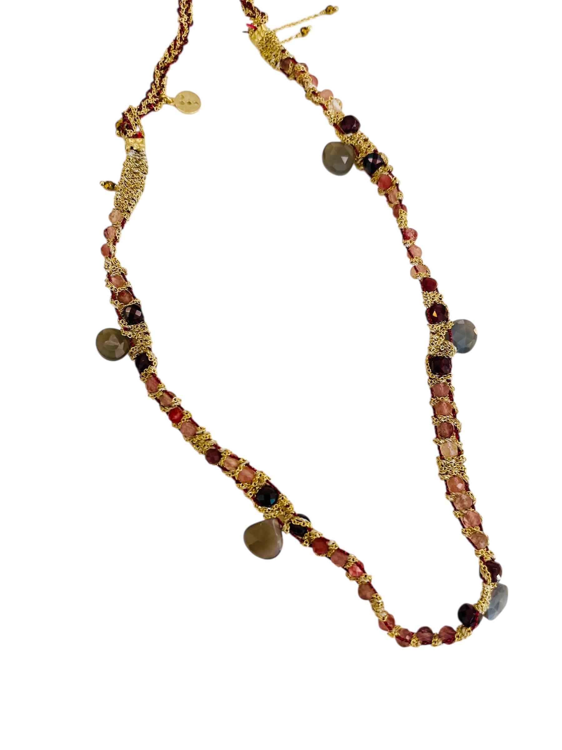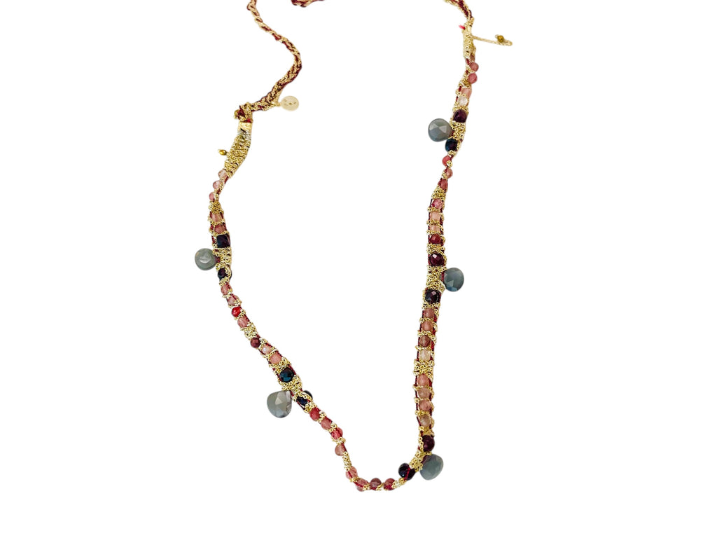 Collier long sautoir avec chaine en argent doré tressé avec des pierres fines quartz alexandrine, grenat, pierre de lune.
