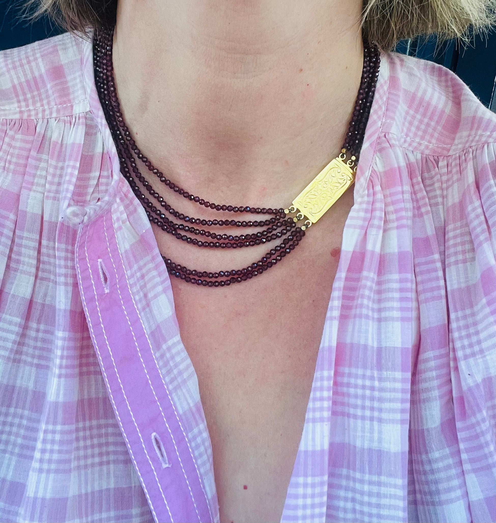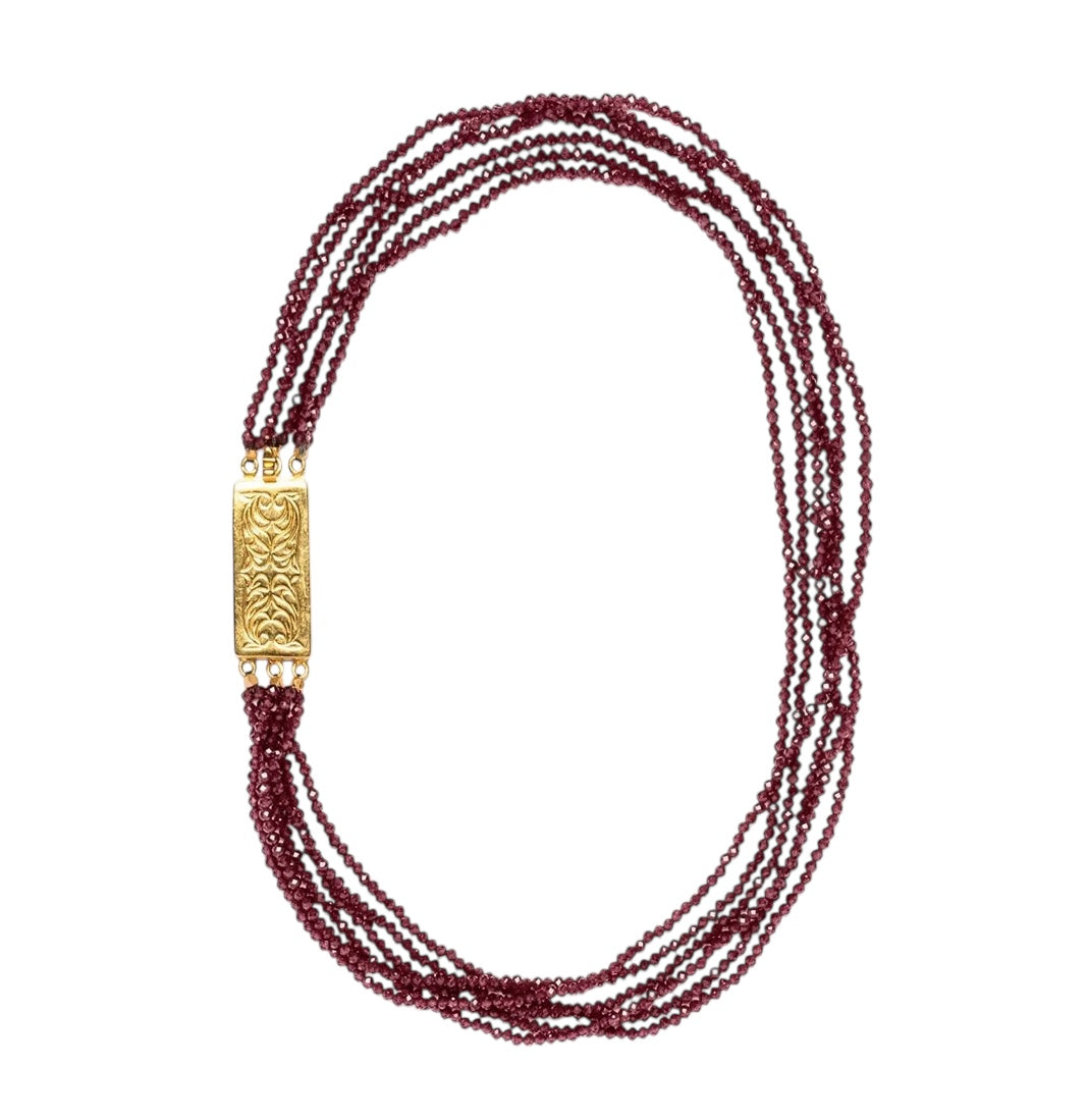 ATHENA est un choker multi-fils en Grenat. Son médaillon fermoir ancien gravé en argent plaqué or 5 microns.