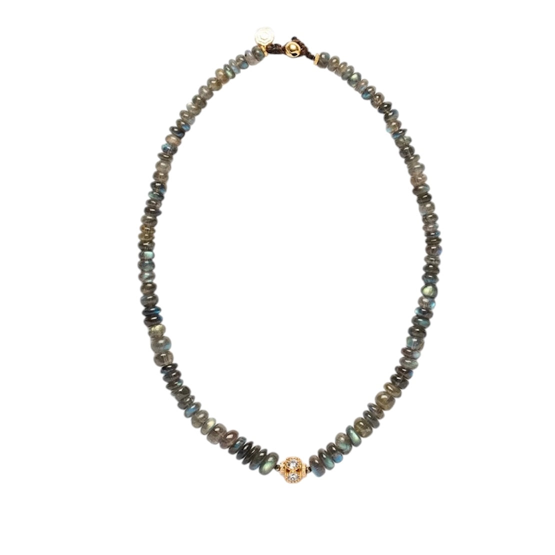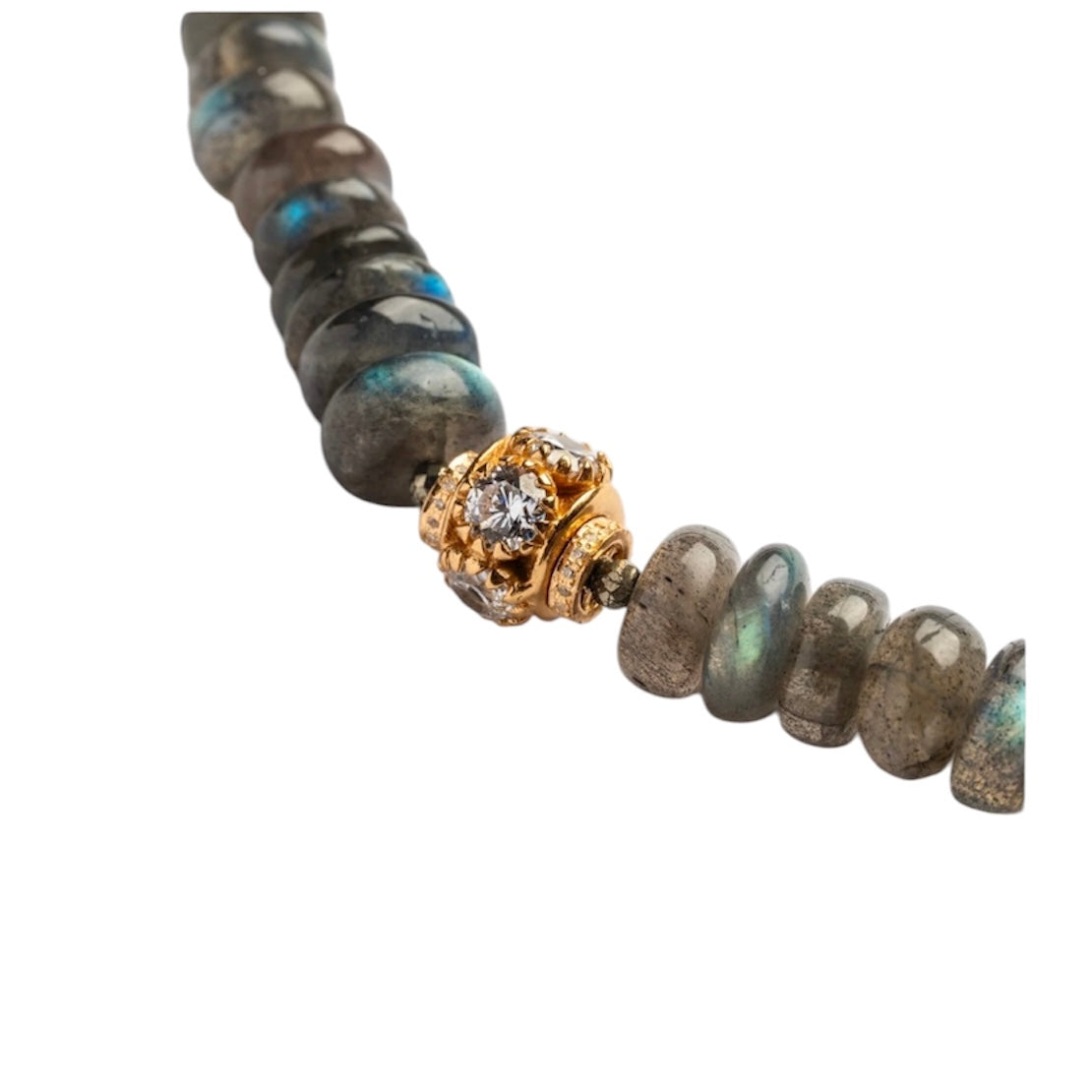 MINERVA est en Labradorite, pyrite, zircons et médaillon en argent plaqué or et gros zircons.