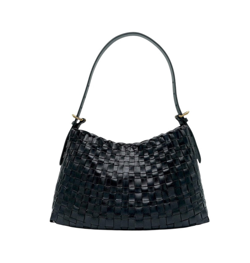 Sac en cuir tressé dark brown avec une bandoulière unique, porté épaule ou main