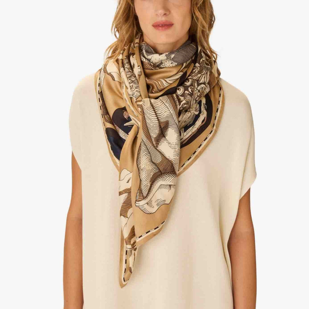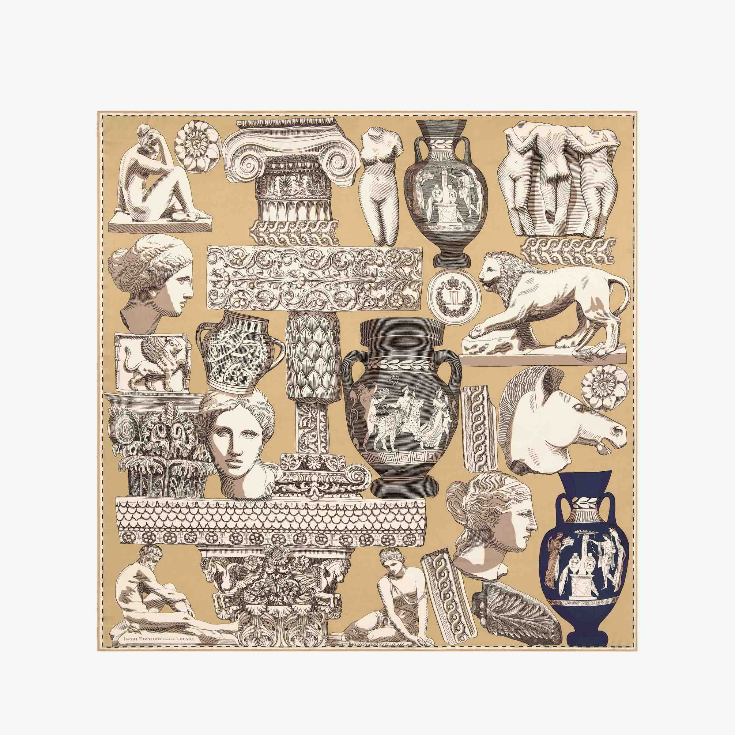 Carré avec objets, sculptures rendant hommage aux collections du musée du Louvre sur fond beige.