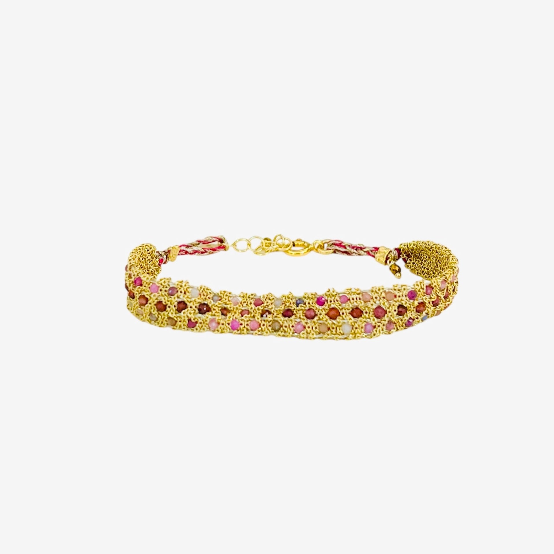 Bracelet composé d'un tissage fin avec chaine en argent doré et pierres fines en grenat & saphir rouge