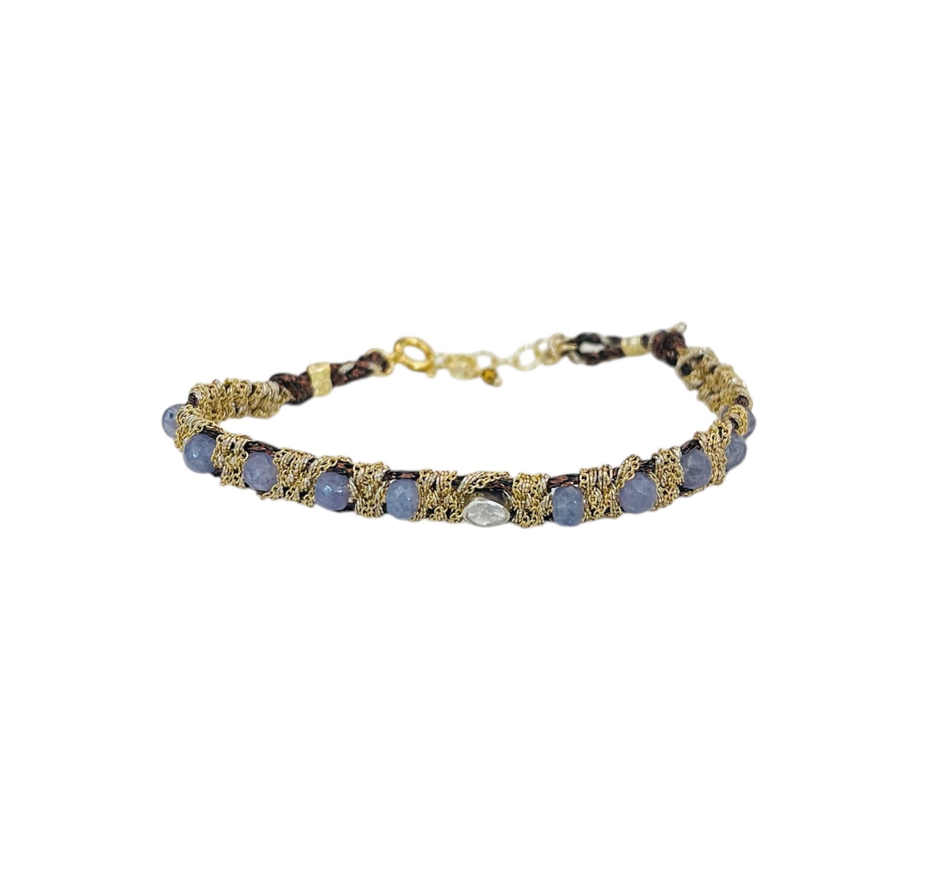 Bracelet composé d'un tissage fin avec chaine en argent doré et pierres fines en tanzanite et en son centre un diamant polki.
