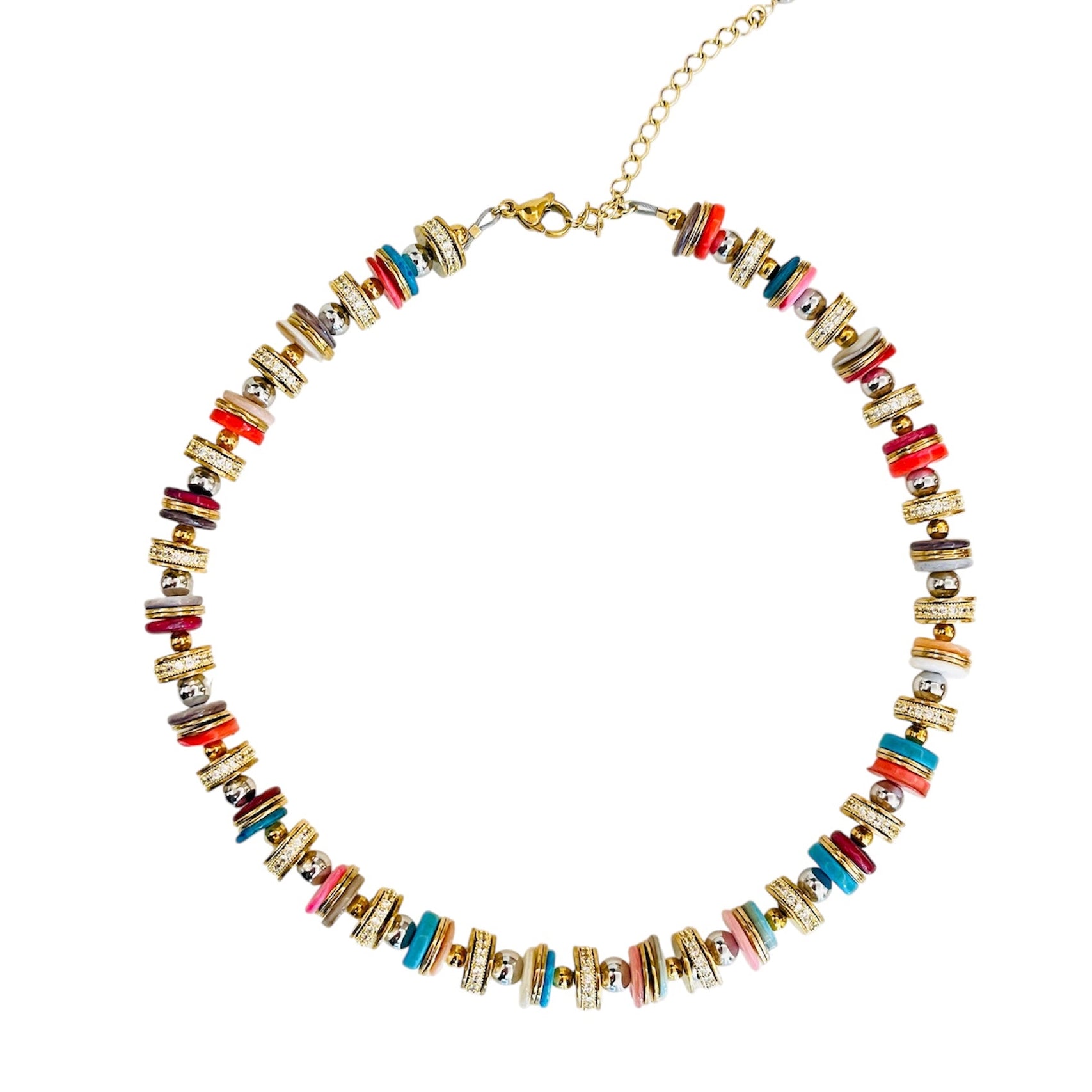 Collier réglable composé de perles multico, dorées et d'oxydes de zirconium sur une monture structurée.