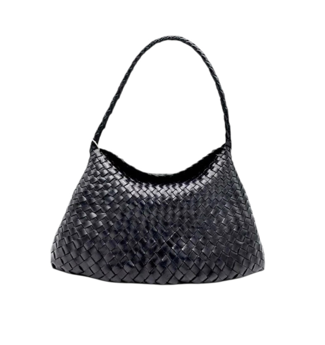 Sac tressé avec rabat et fermeture aimantée, une anse unique pour un porté épaule ou main.