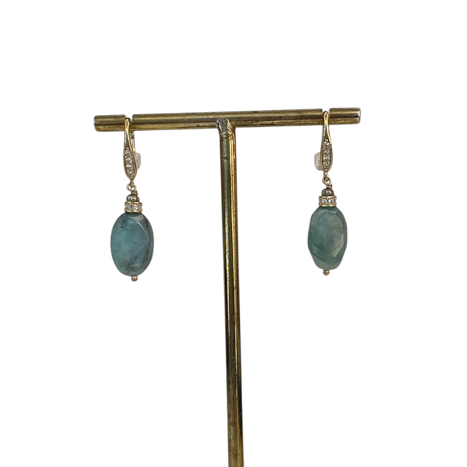 Paire de boucles mixant perles facettées en émeraude, perles grise et zircons blancs
