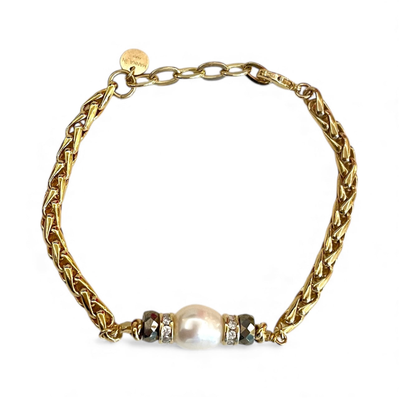 Bracelet avec chaine dorée avec en son centre une perle blanche entourée de zircons blancs et pyrite facettée.