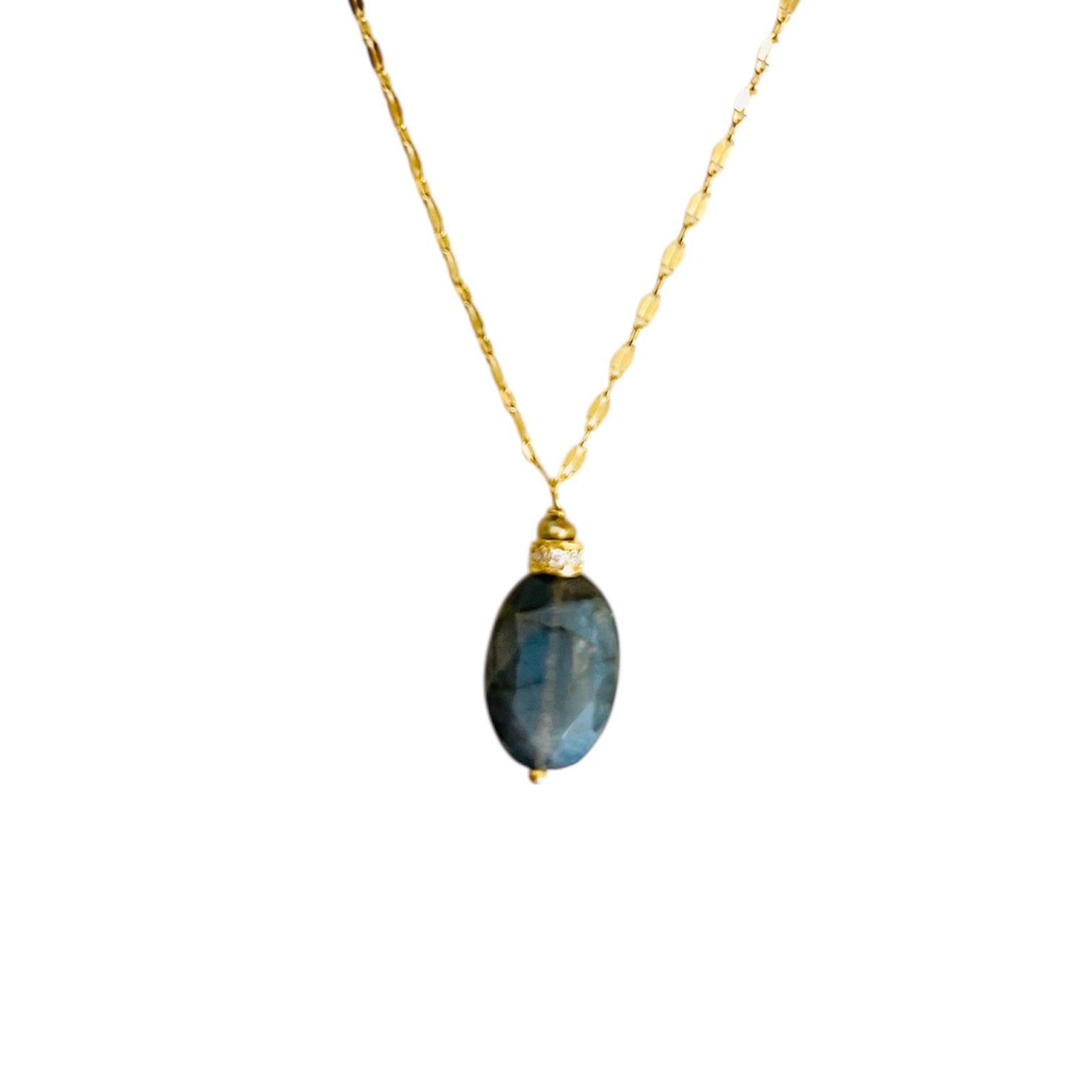 Collier composé d'une chaîne dorée à l'or fin avec en son centre une pierre fine labradorite facettée.