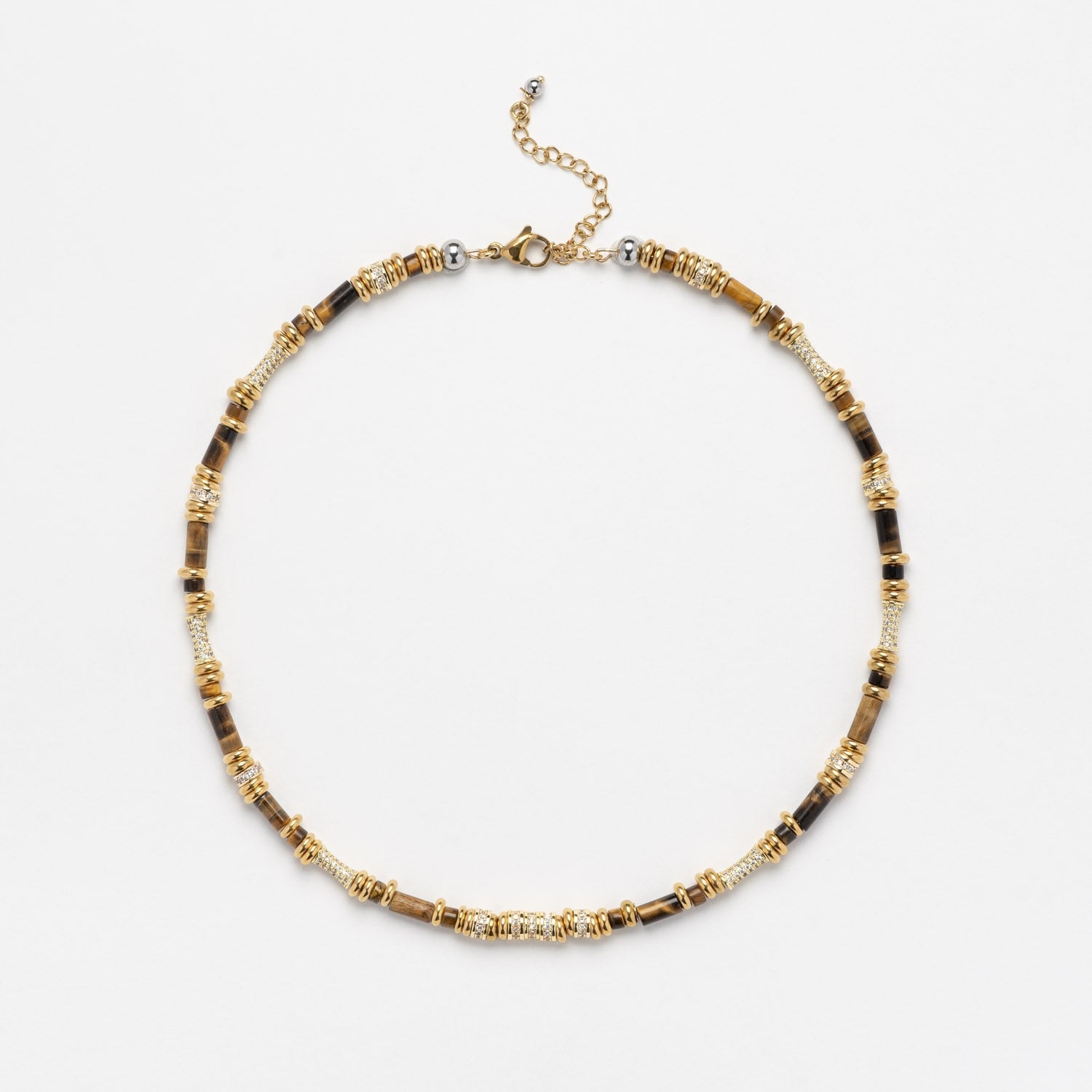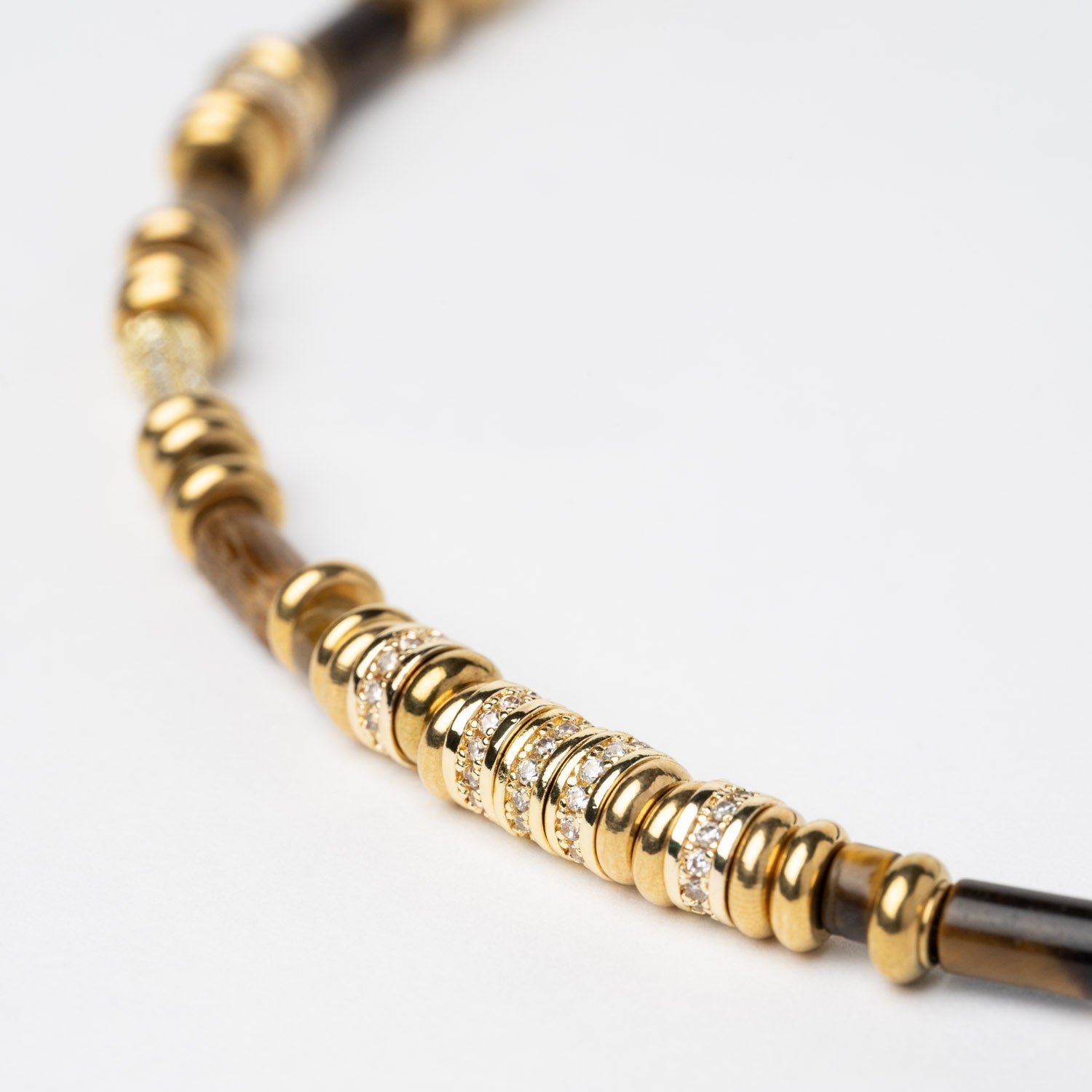 - Matériaux : Laiton, perles tubulaires en oeil de tigre, oxydes de zirconium