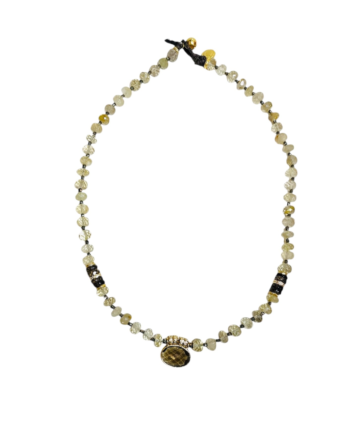 Collier mixant des pierres en golden quartz rutile, pyrites, quartz fumé et avec en son centre du quartz fumé