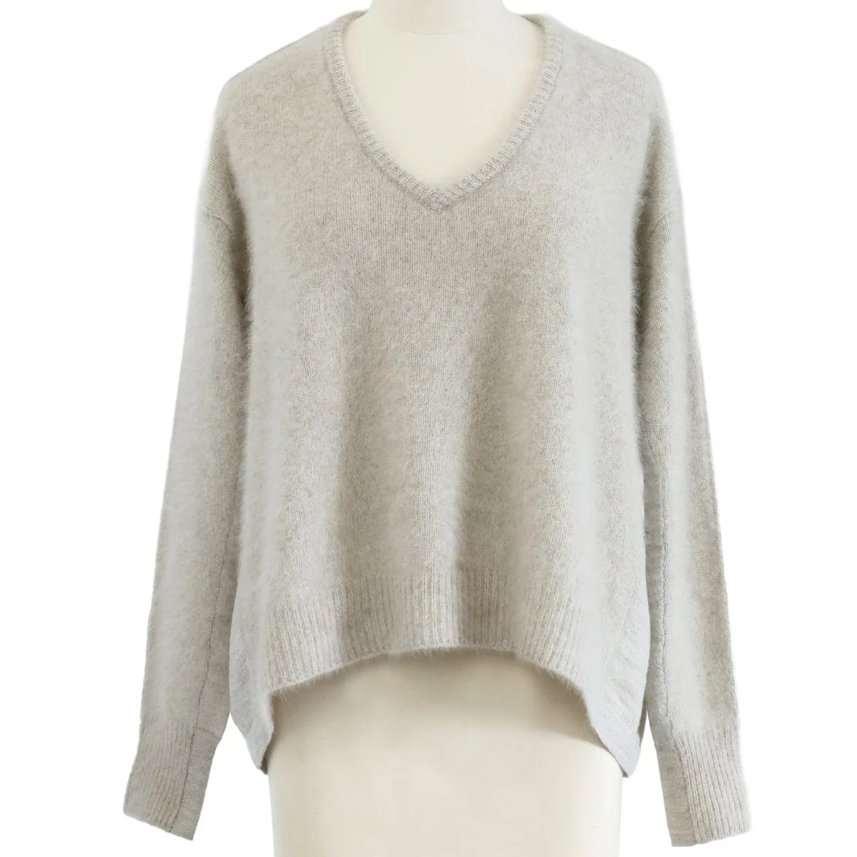 Pull col V bi matière avec mélange de laine ( renard & cachemire) sur le devant et laine dans le dos